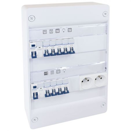 Avec sa structure blanche RAL 9010, il combine esthétisme, praticité et rapidité de mise en œuvre. Il intègre un ensemble complet de disjoncteurs et interrupteurs différentiels, des bornes de raccordement optimisées, ainsi que tous les accessoires nécessaires pour un montage immédiat et sécurisé.
